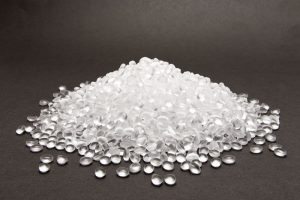 Transparent Polyethylene granules on dark .HDPE Plastic pellets.